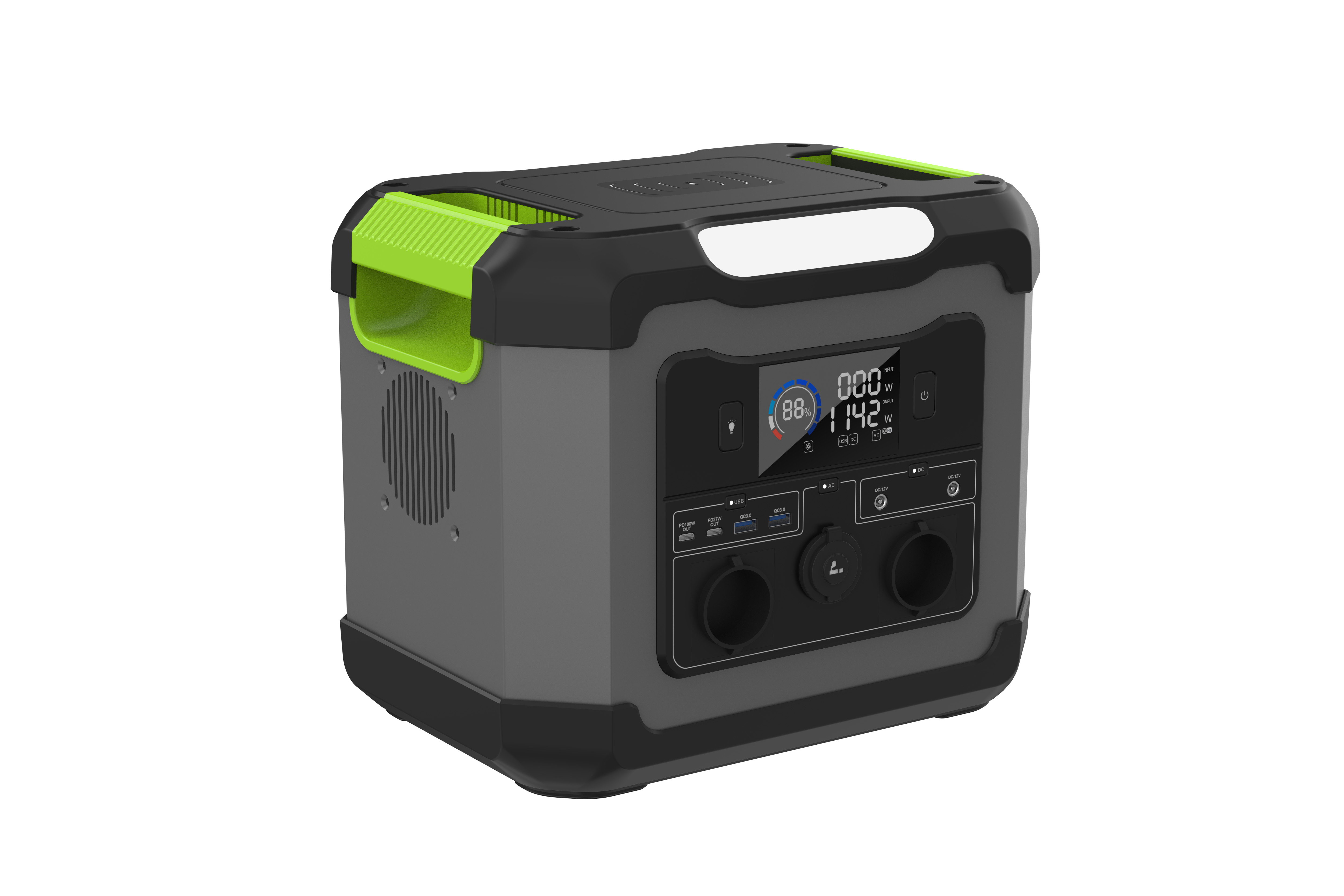 AC/DC 出力ポート: この工場には、AC 電源コンセント 2 つ (110V/230V 1200W/2400W ピーク)、USB-A ポート 2 つ、Type-c ポート 2 つ、DC ポート 2 つ、自動車用ポート 1 つが装備されています。